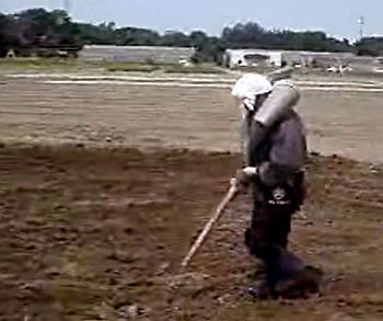 肩車して歩いて施肥。下のY字は風に吹き飛ばされずに施肥するもの。うねに沿って歩く作業。子供にはとても背負えなかった。