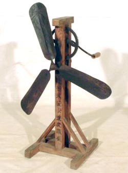 父の工夫から、当時の手動の農機具にプーリーを取り付け、脱穀から「風起し」にまで発動機はフル回転。 こんな器械は穀物に混ざっている屑や塵を風選するもの。
