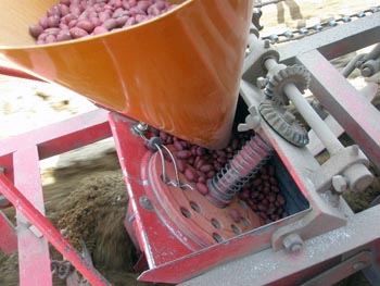 いずれの畑作農家にも数台あった。豆の種類によって円盤を交換、ピッチも換えられる。後部の鉄爪状のもので覆土をしながら進む。大正時代の十勝で考案されたものとか。
