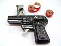 当時、運動会などの出店で100連発ピストルという、うたい文句で売っていたブリキのオモチャピストル。紙玉を買い足して、火薬の匂いを楽しんだ。