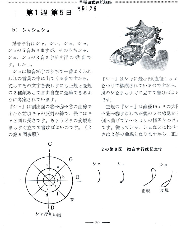 早稲田式速記の仕組みは理解できたし、運筆の練習は後々のフリーハンドの描画に生きたものと思っている。IT時代の現代では「速記」はボイスレコーダーや音声認識から文字情報に変換できるなどから、今思うに中座して良かったのかも知れない。物のない中学時代の体験学習としては貴重なものであった。