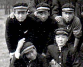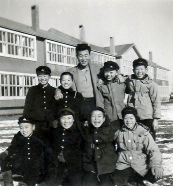 新井先生?制作クラブのメンバーたち/前列左が小生。木造長屋の学校も卒業頃にはモルタルの新築校舎になった。 |