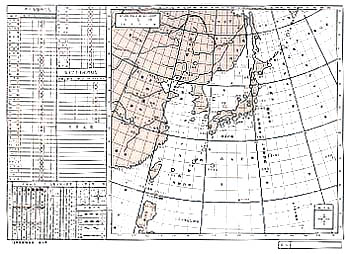 天気図は「ラジオ用天気図用紙」を買って、NHKの気象通報を聞いて書き込み、自分で等圧線などを引けるまでになったものの、用紙も高くてそれまで。ウラジオストック、晴れ、1100ミリバール、北北東の風、風力3などと聞き入って書き込んだものである。 |
