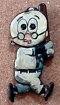 ワルサーP38 子供遊び道具としてはブリキの連発ピストル位しか買えなかった時代、版画の板を二枚あわせでこのモデルを制作、トリガーは竹を曲げて。 グリップに単三乾電池を装填、ガン先に豆電球を入れてガンライトにして、紙でガンホルダーを作って学生服の中に忍ばせて得意になっていた。 ルガー、ベレッタ、南部14年式とかガンモデルのバッジが雑誌をにぎわせていて、それをパンタで拡大、リアルに制作した。 |