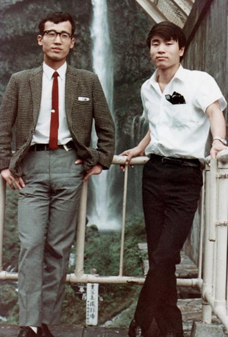 右写真/下宿先と学校の中間の「鶴ケ岱公園」にて。 手前の阿部君とは同じ会社に就職する。 |