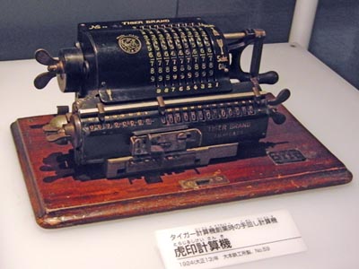 再発行の複写伝票は古いタイプライターで作成。後のパソコン時代にもキーボードに抵抗なく。手回し計算機は使わず。