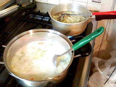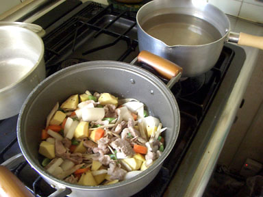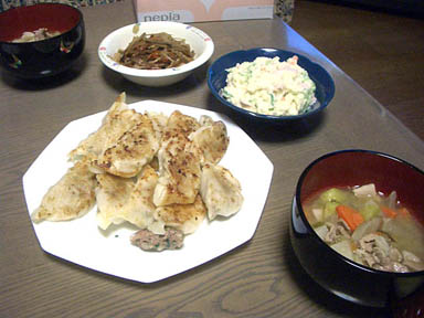 ギョウザ一品では夕食に寂しいので、豚汁か野菜シチューをセットします。冷凍保存するので月に一度の制作です。 |
