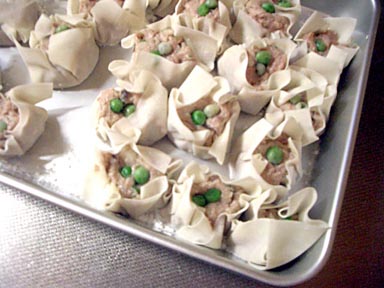 ギョウザ同様、皮は市販品。冷凍巻エビを刻んでいれて、グリーンピースは缶を買って冷凍しておいたもの。
