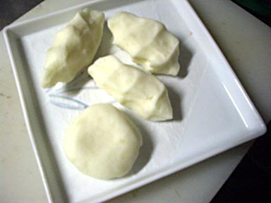 少し大きめの皮を購入、結構「手繰り寄せ」て形を作るのは面白いものですよ。焼いて食べれば同じですが。