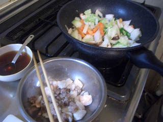 肉は少しでイカ、エビに野菜タップリ。酢豚よりヘルシーかも。肉、エビ、イカを炒めて取り出し、野菜を炒めて合わせますが深いフライパンだけで仕上がるのでまあ楽なほうです。