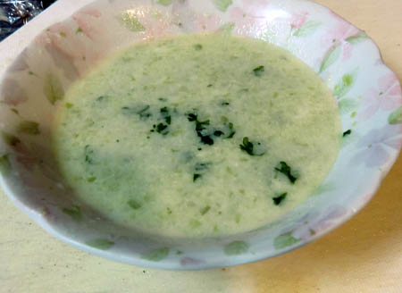 トッピングにキャベツ、キュウリなどの青野菜をミキサー。煮て粉寒天を混ぜて冷やして。初めて寒天で固めてみました。くず野菜も生かせます。