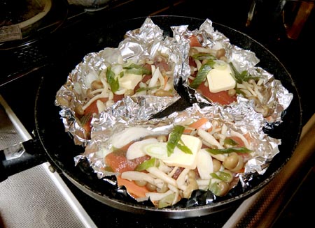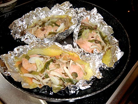 生鮭の皮も、骨もとり、酒、バター、塩コショウを乗せて蒸し焼きにします。しめじや玉ねぎスライスなどを敷いて。