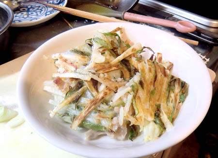 長いもを細切り、あとピーマンなど加えて焼くのですが、間に豚肉を挟んで両面焼きます。長いものべたつきなく出来上がります。