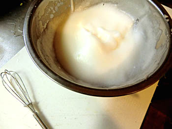 「クックパッド」で納豆料理を検索して初めて「メレンゲ」制作にトライ。とても手でかき回すには大変なので、といって普段ケーキ作りはしないので買わずに、電動ドリルを代用。卵の白身は半分冷凍位で使うとうまくいく、とのことで。