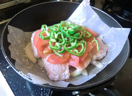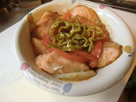 生の鮭をただのムニエル焼きでは面白くないので、タマネギ、トマト、ピーマンを乗せて焼いたものの生臭く失敗作、です。鮭は別に焼いてバター炒めの野菜に乗せたほうが。