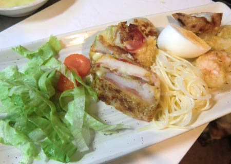 ベーコンを焼いて、ポテトマッシュとトマトスライス、スライスチーズ、レタスを重ね小麦粉、卵、パン粉でフライパンで焼いてというものですが、型崩れしてとてもやっかいでした。マッシュを薄くしたほうが良いこと、夏の暑さでチーズが溶けて焼く前にまさに形無し。