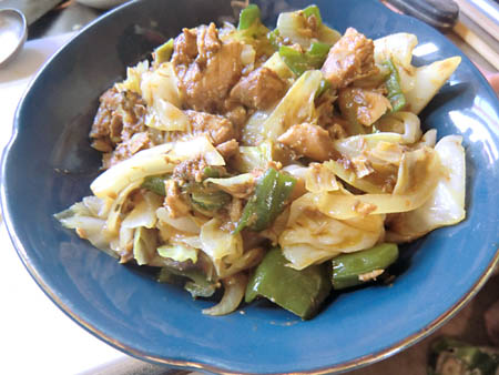 「あさイチ」NHKテレビでやっていた、「サバの味噌煮」缶詰をつかった料理。キャベツ、ピーマンを炒め、缶詰のサバをいれる。