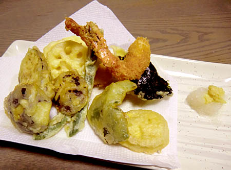 レンコンの薄切り、しいたけ、ナス、サツマイモ、エビ少々、海苔、ピーマン、インゲンが定番、大根おろしは解凍して。