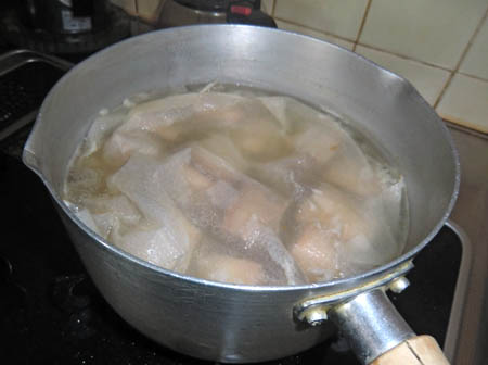 米の磨ぎ汁でまずは4時間ほどコトコトと。