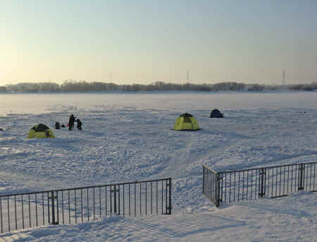 早朝7時、快晴なれどマイナス10度クラスのギンギンの茨戸川。釣り人のテントもまばらで壮観な冬景色。