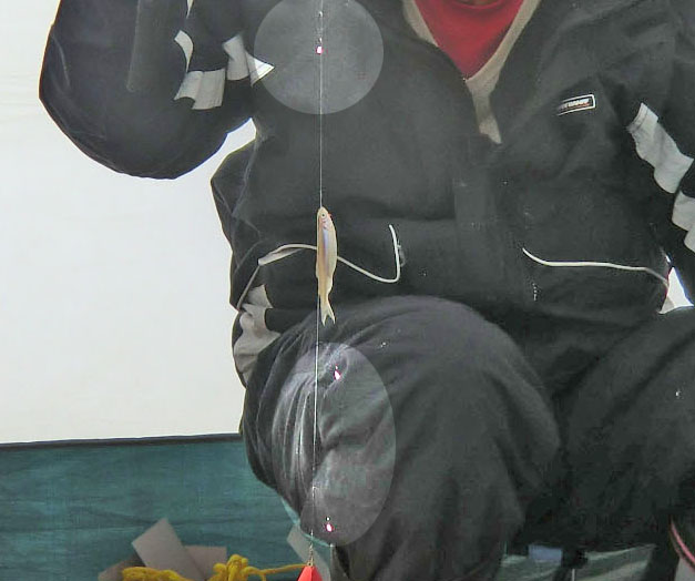 ようやく全員が穴の中でスタンバイ、問題は釣り針が小さく、餌も小さく老眼にはつらいものあり。牧野さんに餌付けを依頼して。