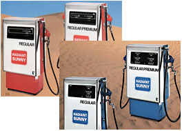 ケーシングは前後共通だが、給油機能もシングル、ダブルともに共通化されている。ポンプ・モーター・流量計・カウンターの機能ユニットがダブルで組み込まれる構造となっている。 一見無駄に見えるようだが生産管理上のメリットのみならず、シングルが片方に寄ったデザインは計算されたデザインである。 |