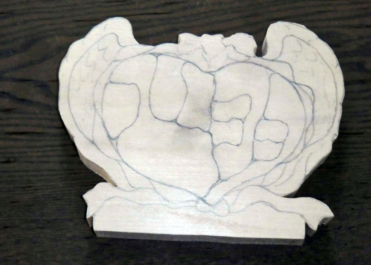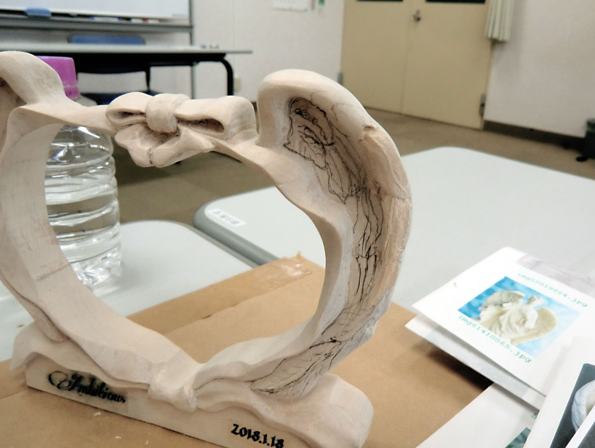 まずは荒削り。レリーフと違って厚みがあっ て意外とリボン部分に苦労する。途中から