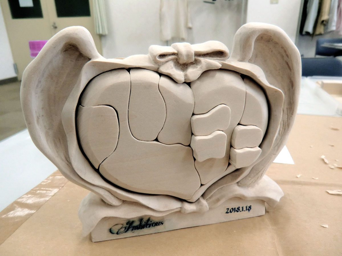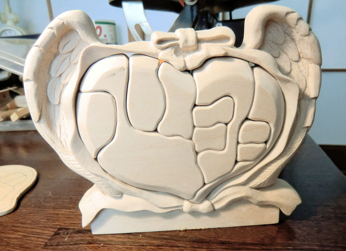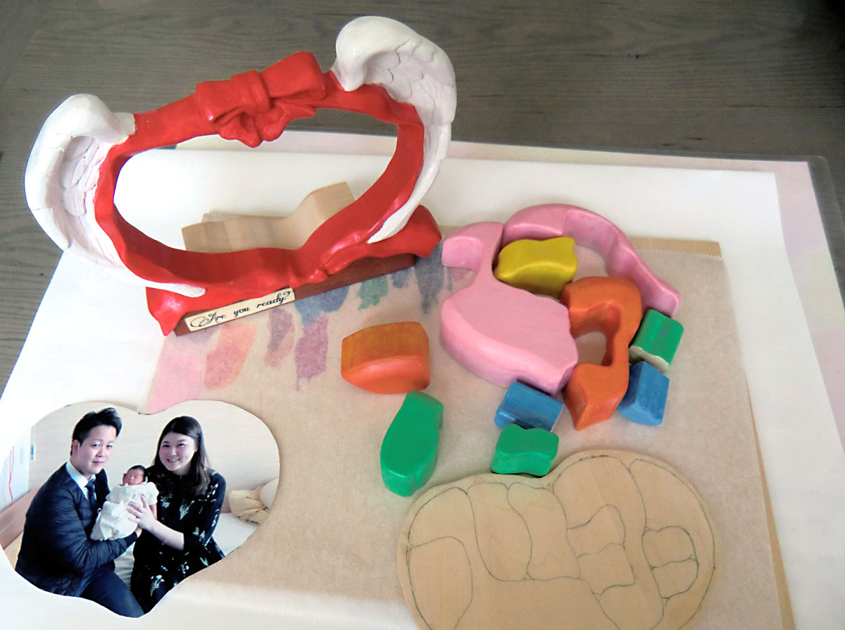 孫が2018年1月に生まれたので、その名前の組木を彫りたいと思っていたことと、「心羽(こはね)」の心はハート、羽は「天使の羽」を飾ろうということで。制作中に爺からのメッセージもいれてはと