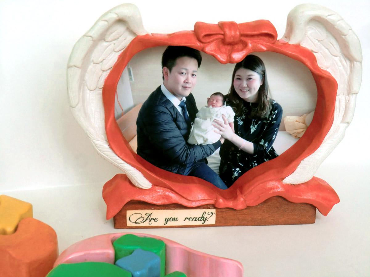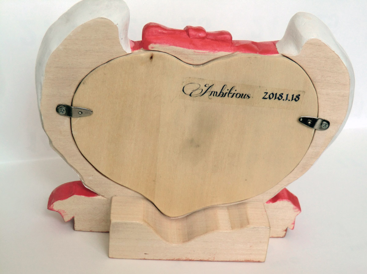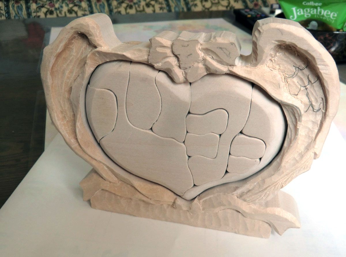 孫が2018年1月に生まれたので、その名前の組木を彫りたいと思っていたことと、「心羽(こはね)」の心はハート、羽は「天使の羽」を飾ろうということで。制作中に爺からのメッセージもいれてはと