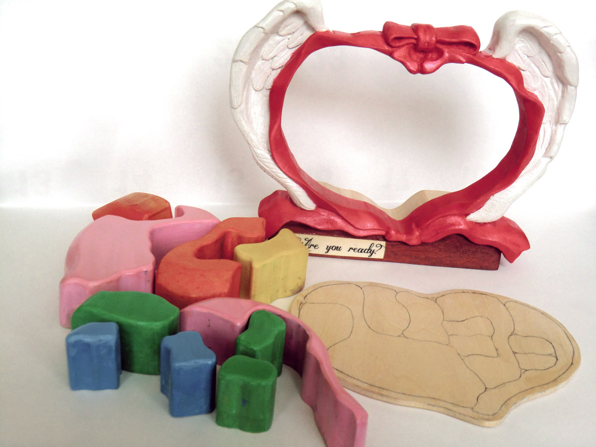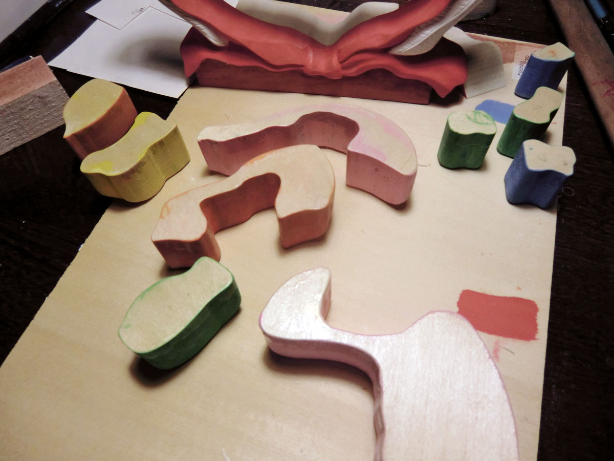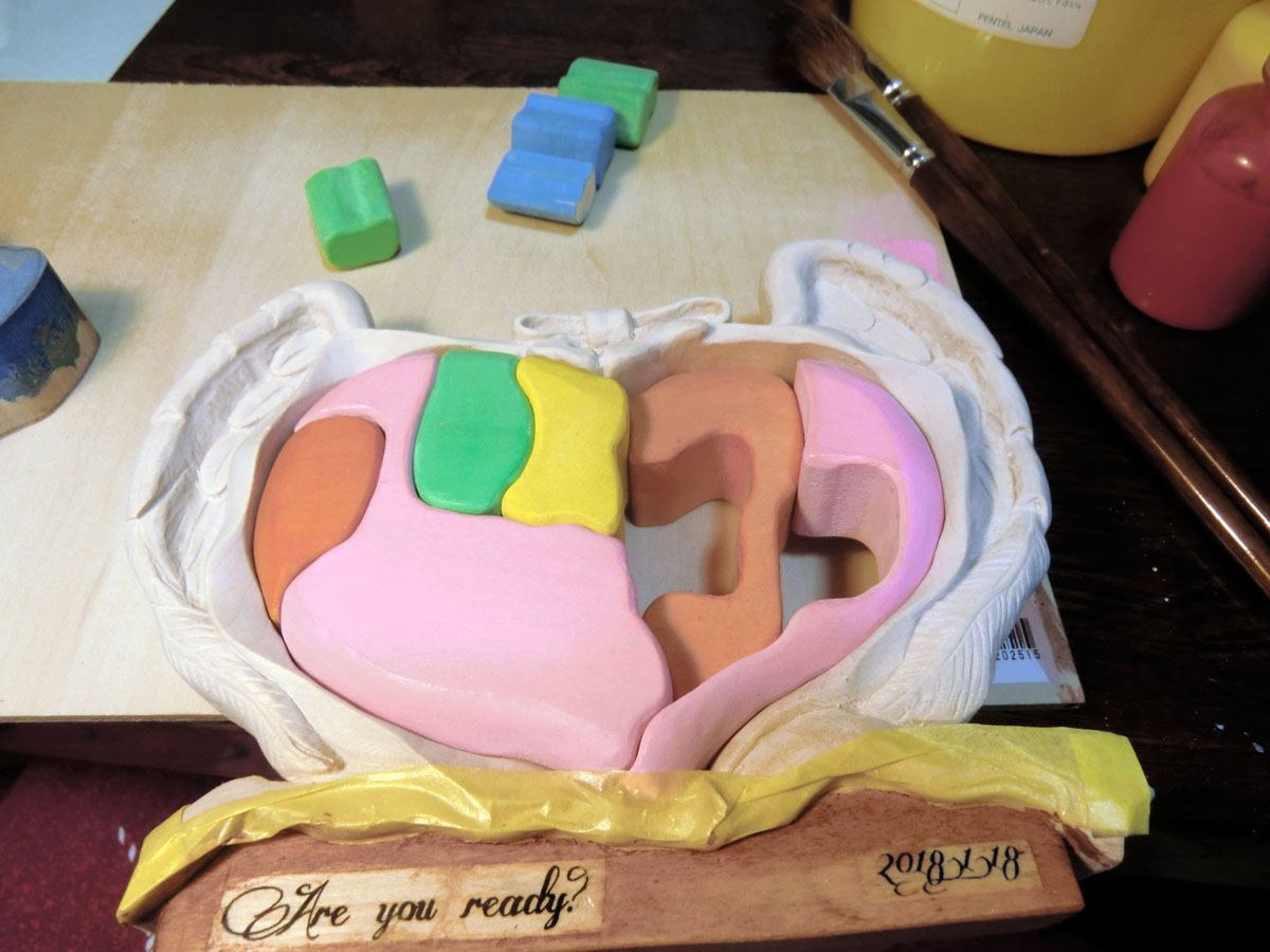 マスキングしながらのペイント、コの字形状のパーツが水分で反って枠に入らなくなり、慌てて強制的にはめながら乾燥させる。ポスターカラーを使ったので透明感は出せず、木彫のよさがでない。 |