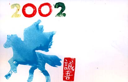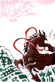 隠し文字は「南無阿弥陀仏」「頌春」です。 馬の耳に念仏、まあ唯我独尊というか、そんなことはどうでも良く、不景気を蹴散らしてくれまいかと。 木版画の面白いところは絵の具の濃さによって、流れが変化して一枚一枚が違う表情になるというところです。 |