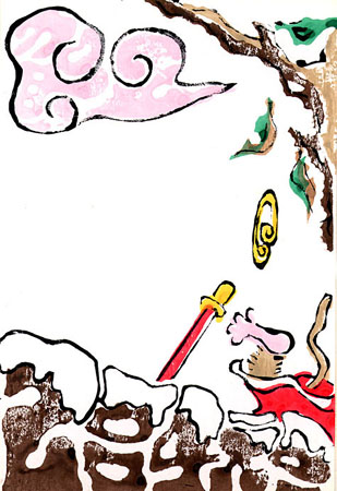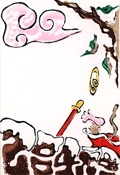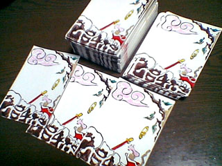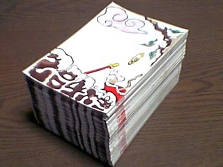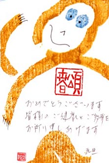 見ての通り「猿も木から落ちる」の孫悟空版です。 筋斗雲(きんとうん)の中に賀正を書き込んだのですが、ほとんどの人は「賀正」が判読できなかったようです。 |