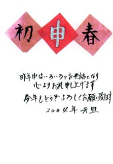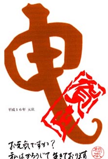 申年、ということでこの「申」文字をデフォルメして木に利用しようと考えたのですが、理解して貰える範囲でのデフォルメでは構図にムリがあり、そのままの枯れ木のイメージにしました。「猿」をそのまま表現する予定でしたが、茶系の色ばかりで暗い賀状になるので孫悟空を連想。やはり賀状は赤とか黄色、グリーンも入れないと華やかさに欠けると思います。 2004年は「0」を並べたかったのですが、構図的にムリがありました。