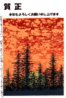 | 青春時代の友達で何時もシルク印刷にこだわる彼のオリジナルです。 | 素朴ですが、和紙を貼り、加筆している心のこもった賀状です。 | 重ねプリントされた重厚な作品です。 | |