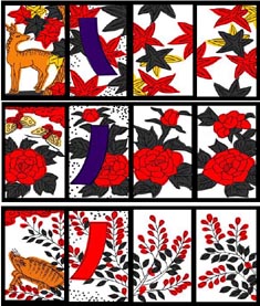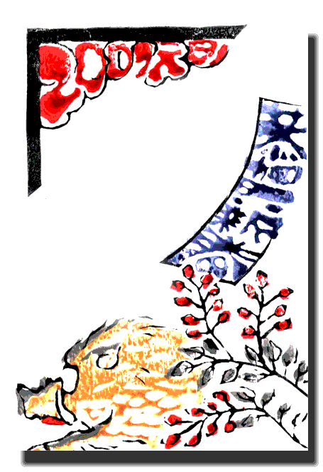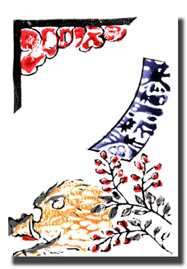 隠し文字は「2007 元旦」と「恭賀新春」です。 イノシシは猪突猛進位で、たとえ話などの公知のストーリーがなく、 結局誰もが考えるような「花札」、です。 花札では猪鹿蝶(イノシカチョウ)といったところですが制作が大変 なので鹿も蝶もやめました。 |