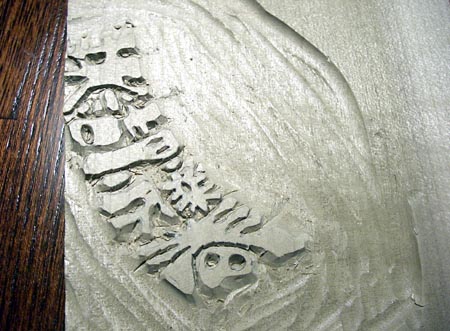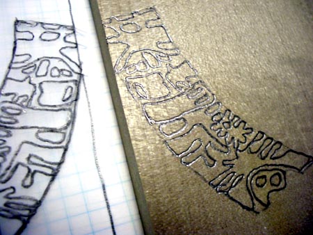 文字を反転して書き込み彫刻刀で掘り出します。版木の白い部分を避けて配置しないと細かい彫りはできません。 |