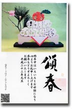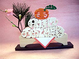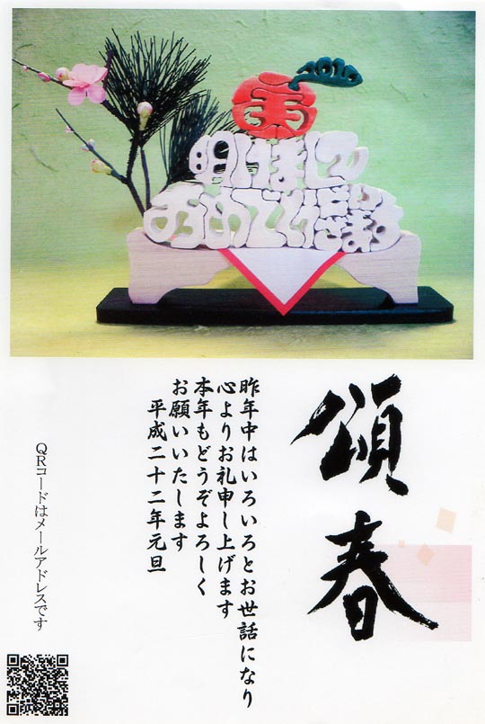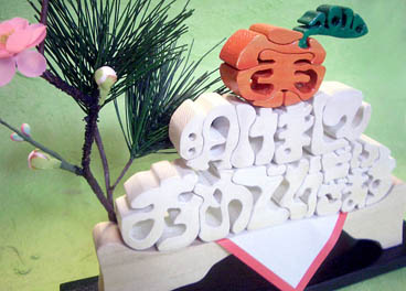 何時もの版画は賀状に転写するのがとてもつらい作業です。今年は印刷でしたので フィニッシュは早くて助かりました。組木文字のページも参照下さい。 |