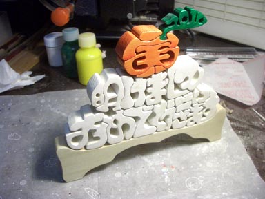 基本的には積み重ねるだけの文字ですが、不安定なので結局接着しています。材料は100円ショップのまな板を電動糸鋸で切り出しています。 あと5mm厚いと安定するのですが。