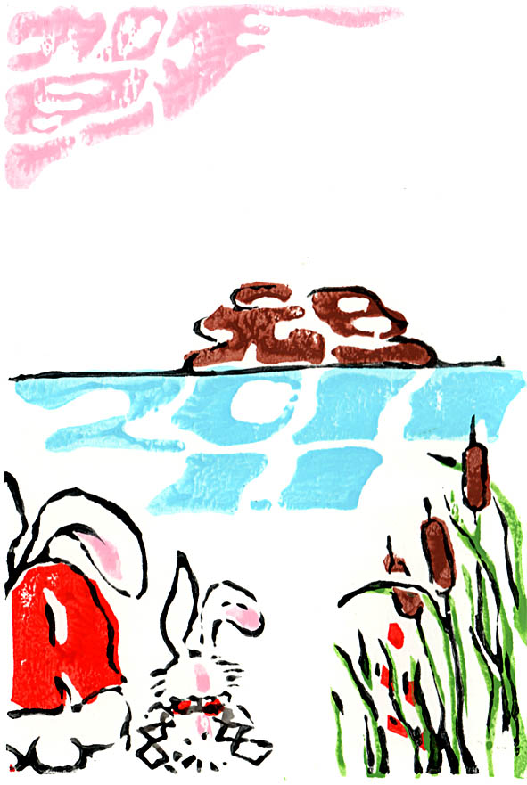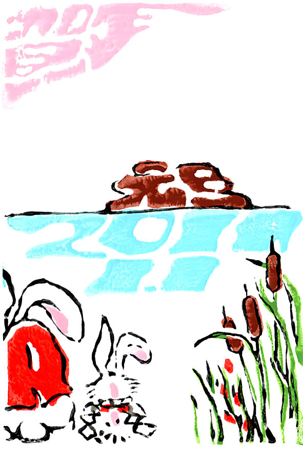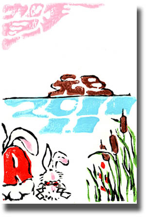 気持ちは、そもそもワニをだましたウサギから始まったことで、その反省を子ウサギに紙垂(しで)をつけて再び訪れた、といったところです。まあ若気の至りを悔いる歳ということでしす。 がまの穂に見えますか。 |