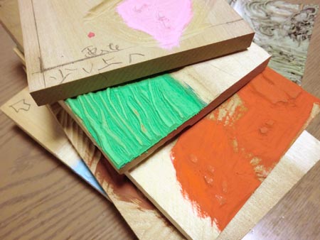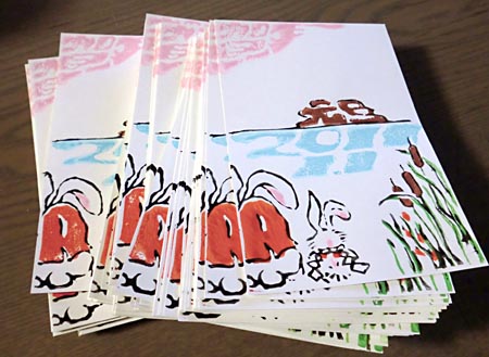 ほとんどの版木がハガキサイズなので刷り合わせの位置あわせが難しく、まあ多少のズレも愛嬌ではと、こだわりの努力をしていません。 6版を刷り上げるのは大変な労力です。歳を考えるとプリンターに頼りたくなる誘惑に悩みます。バレンを持つ右肘に筋肉痛です。 |