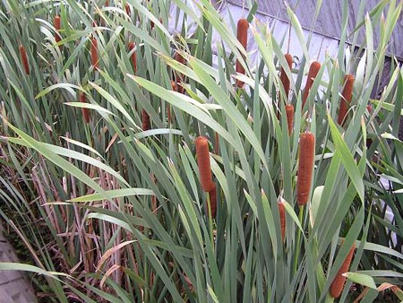 「ガマ(蒲)」はガマ科の多年草で、日本全土の池や沼に分布しており、水の中に地下茎をのばして生長し、葉の高さは1〜2mになる植物です。 葉は幅1〜2pで、長さは50cm〜150pになり、茎の先には円柱型の花穂をつけます。 穂の上部は細く、雄花が集まっており、下部は赤褐色で太く、雌花が集まっています。 子供のころ、むしってこれがウサギの毛になった?と 不思議がった記憶があります。 |