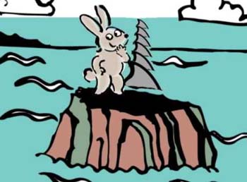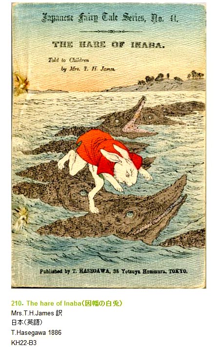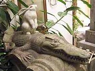 左の写真が「おとぎ話」の原画なんでしょうか、 「古事記」にある出雲神話には、「因幡の白兎」というタイトルで「海のワニ」をだまして海を渡るウサギの物語としていますがワニとかサメとか定かでないようです。 ネットにはこんな画もありますが、