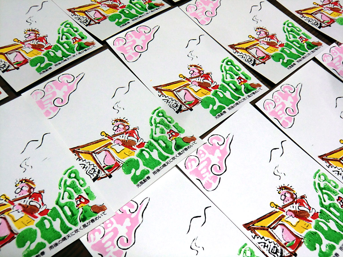 制作、利用した版木の容姿。ハガキサイズの版木なので「当り」を作れず重ねに苦労します。 |
