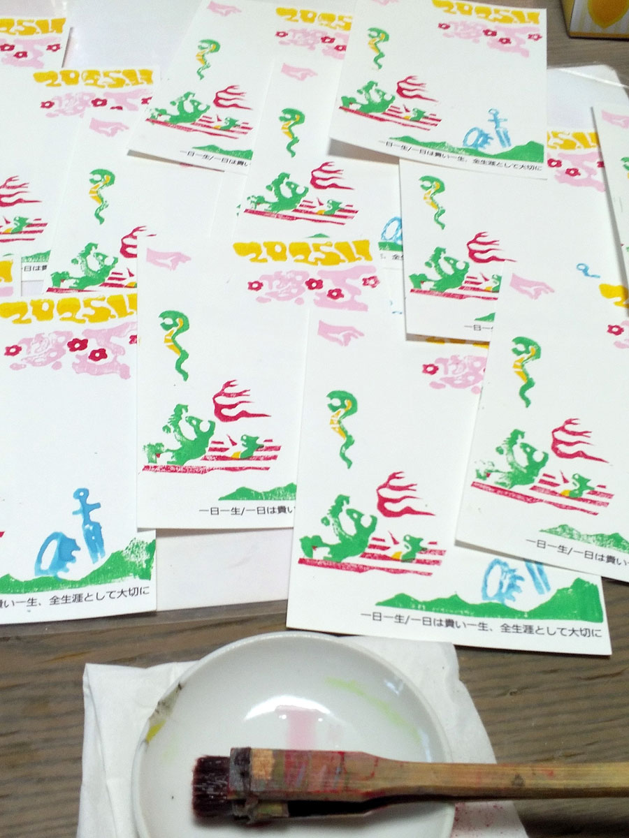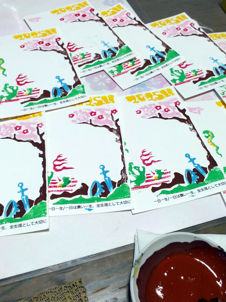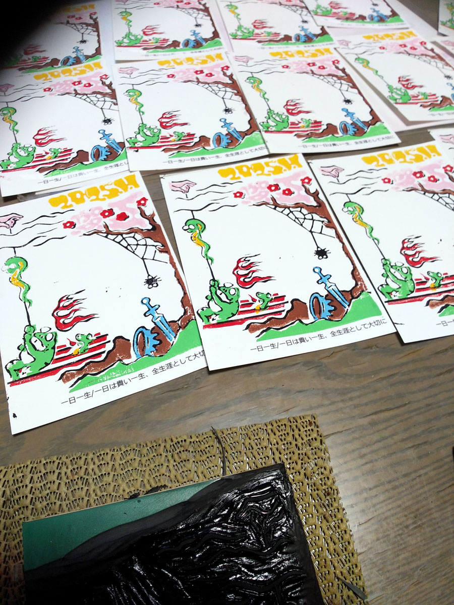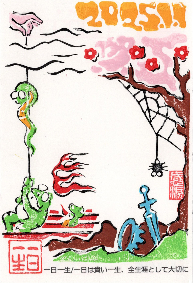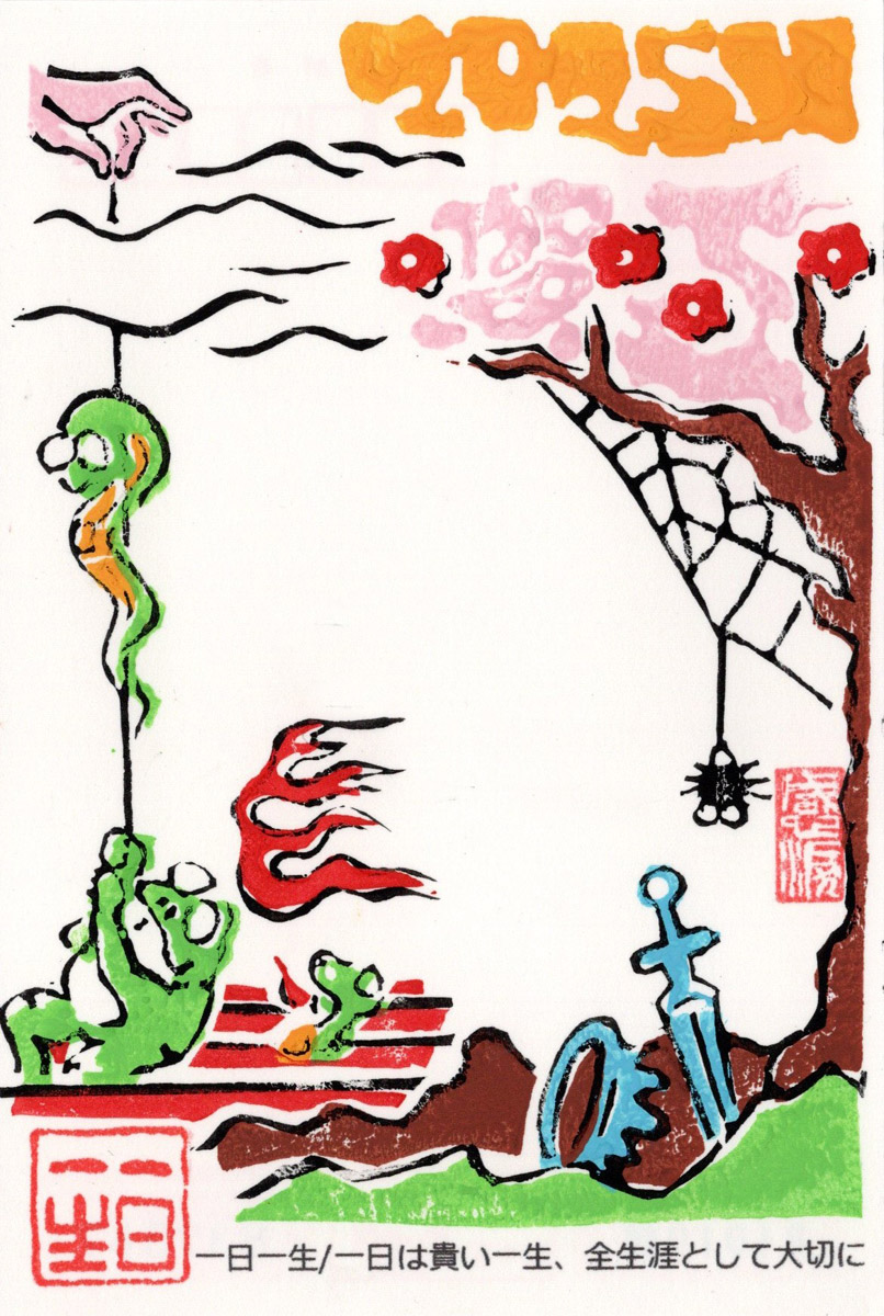 「くもの糸」と平和がテーマの賀状です。 なぜか版画のことを考えると頭から「蜘蛛の糸」が 離れず、干支とどう繋がるか、思考し尽くして。 芥川の意図は独りよがりの悪、といったところでしょうが 蛇に恨みのあるカエルにまかせて。 蜘蛛の巣、で蜘蛛の糸にイメージできるようにしながら、 平和のシンボルを入れ込むというもくろみ、ですが。 右下はヤマタノオロチ 退治されたその後